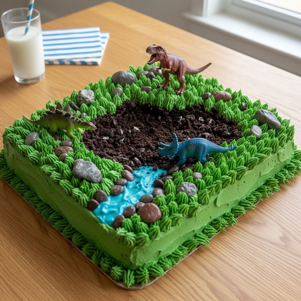 There is something undeniably magical about a childhood birthday party, and the centerpiece of that magic is almost always the cake. For parents, however, the pressure to produce a confectionery masterpiece that rivals the glossy images on social media can be overwhelming. Enter the Dinosaur Excavation Cake—a brilliant solution that combines the ease of a standard 9×13 sheet cake with the high-impact visual appeal of a professional bakery creation. This isn’t just a cake; it is an edible landscape, a prehistoric terrain of chocolate crumble ‘dirt,’ lush buttercream ‘grass,’ and candy ‘boulders’ that invites children to explore before they devour. The base is a deeply rich, fiercely moist chocolate cake that relies on the classic combination of hot coffee and buttermilk to achieve a texture that is both sturdy enough to hold decorations and tender enough to melt in your mouth. Unlike complex tiered cakes or precarious cut-up shapes that risk falling apart, this sheet pan method offers a stress-free canvas. You don’t need to be a sculptor to make this work; you just need to be willing to play with your food. The beauty of this recipe lies in its forgiveness—crumbled cake and messy frosting only add to the rugged, adventurous aesthetic of a dinosaur dig site. Whether you are celebrating a budding paleontologist or just a kid who loves T-Rex, this cake delivers on flavor, fun, and nostalgia in equal measure.